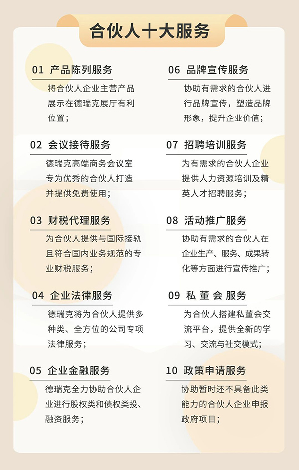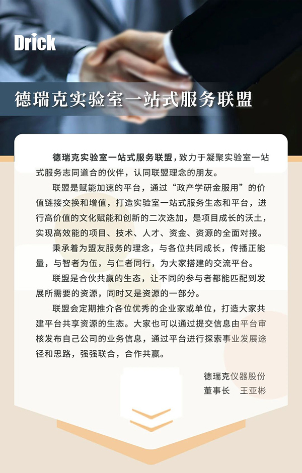 德瑞克實(shí)驗室一站式服務(wù)聯(lián)盟,致力于凝聚實(shí)驗室一站式服務(wù)的核心戰友、志同道合的伙伴,認同聯(lián)盟理念的朋友。通過(guò)政產(chǎn)學(xué)研金服用的價(jià)值鏈接,打造實(shí)驗室一站式服務(wù)生態(tài)和平臺,讓不同的合作機構,單位,企業(yè),個(gè)人得到發(fā)展的機遇和發(fā)展的空間。聯(lián)盟是一個(gè)生態(tài),讓不同的參與者都能匹配到發(fā)展所需要的資源,同時(shí)又是資源的一部分。此外,聯(lián)盟還會(huì )定期推介各位優(yōu)秀的企業(yè)家和其企業(yè)的主營(yíng)業(yè)務(wù),打造“共建平臺、共享資源"的聯(lián)盟新生態(tài)。