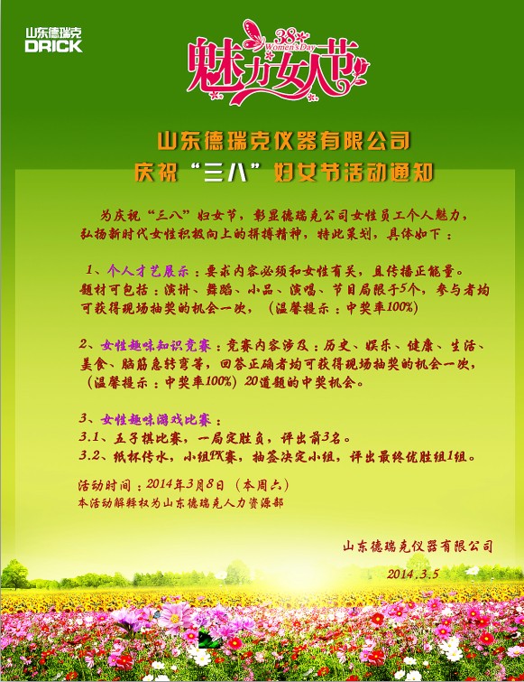 我國于1949年12月規定每年的3月8日婦女節,迄今為止已有60多年的歷史,而今年恰逢是三八婦女節第65周年。為了活躍企業(yè)文化氛圍,表彰和感謝女同胞們?yōu)楣咀龀龅呢暙I,山東德瑞克儀器有限公司決定于3月8日為所有女員工準備了一系列別開(kāi)生面的歡慶活動(dòng),在表彰和感恩的同時(shí)也為德瑞克女同胞們展示個(gè)人才藝,彰顯女性風(fēng)采提供了一個(gè)良好的舞臺?;顒?dòng)具體內容如下: